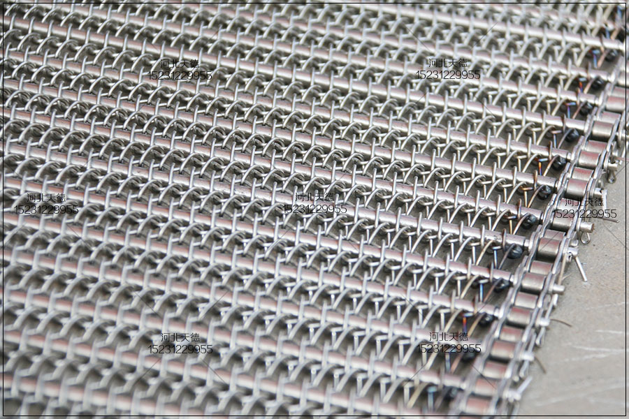 大滾珠輸送鏈輸送平穩(wěn),拉力大不跑偏,下面圖片展示的鏈條輸送帶總寬度是1米,長度為30米,絲徑采用1.5毫米的鋼絲壓彎編織的,編織孔大小為8*15毫米的。