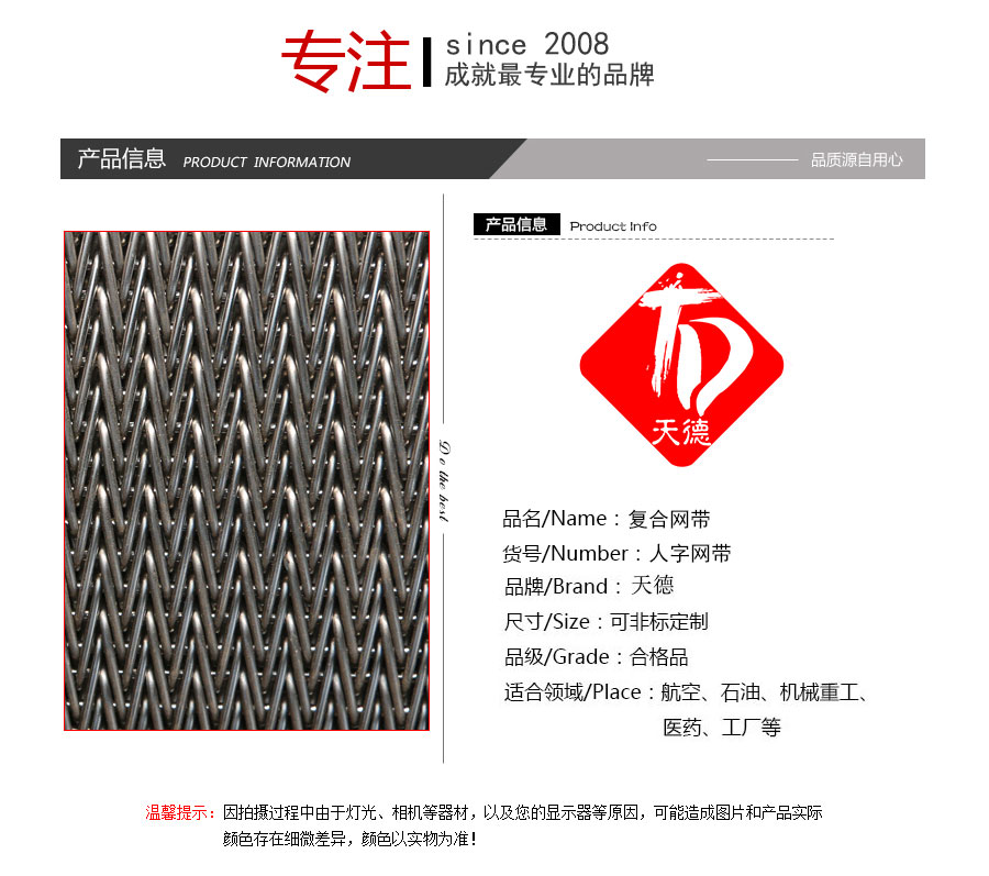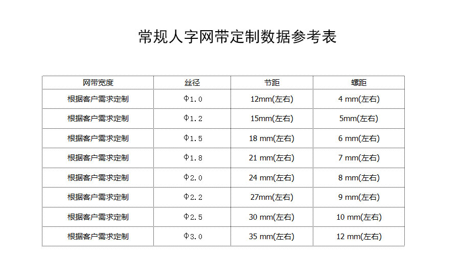 人字形網帶應用:主要應用于食品烘干機、蔬菜、海產品清洗機,巴氏機,方便面米粉蒸煮、熱收縮膜包裝機。玻璃瓶罐、食品、燈炮、金屬、器皿、化纖、印染、醫藥、電子、粉末冶金、熱處理、木材、物流輸送等各行業自動裝置和自動流水線的使用;焦爐煤氣及電子紅外線等各種窯爐系統的傳動使用等食品機械,玻璃機械,輸送機械。