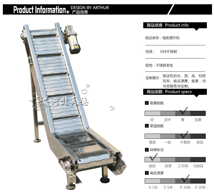 鏈板材質:碳鋼、不銹鋼、熱塑鏈,根據您的產品的需要可選取不同寬度、不同形狀的鏈板來完成平面輸送、平面轉彎、提升、下降等要求。
